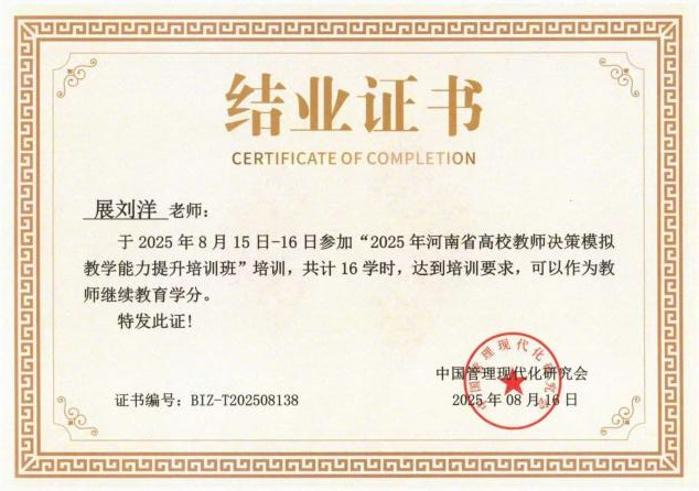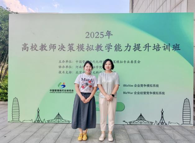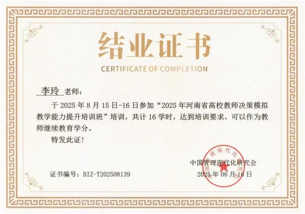 近日,为有效支持全国企业竞争模拟大赛的学科竞赛工作,由中国管理现代化研究会决策模拟专业委员会主办、河南财政金融学院承办、北京金益博文科技有限公司提供技术支持的“2025年高校教师决策模拟教学能力提升培训班”顺利举办。我院教师展刘洋、李玲圆满完成决策模拟教学能力提升培训,双双荣获结业证书。