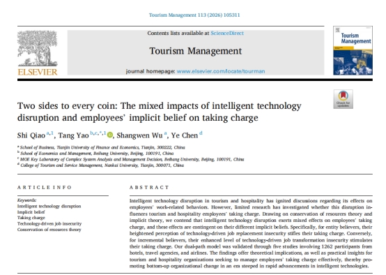 2025年9月23日,我校yl6809永利官网乔时副教授(第一作者)和研究团队在旅游管理国际顶级期刊Tourism Management上发表论文“Two sides to every coin:The mixed impacts of intelligent technology disruption and employees’ implicit belief on taking charge”。