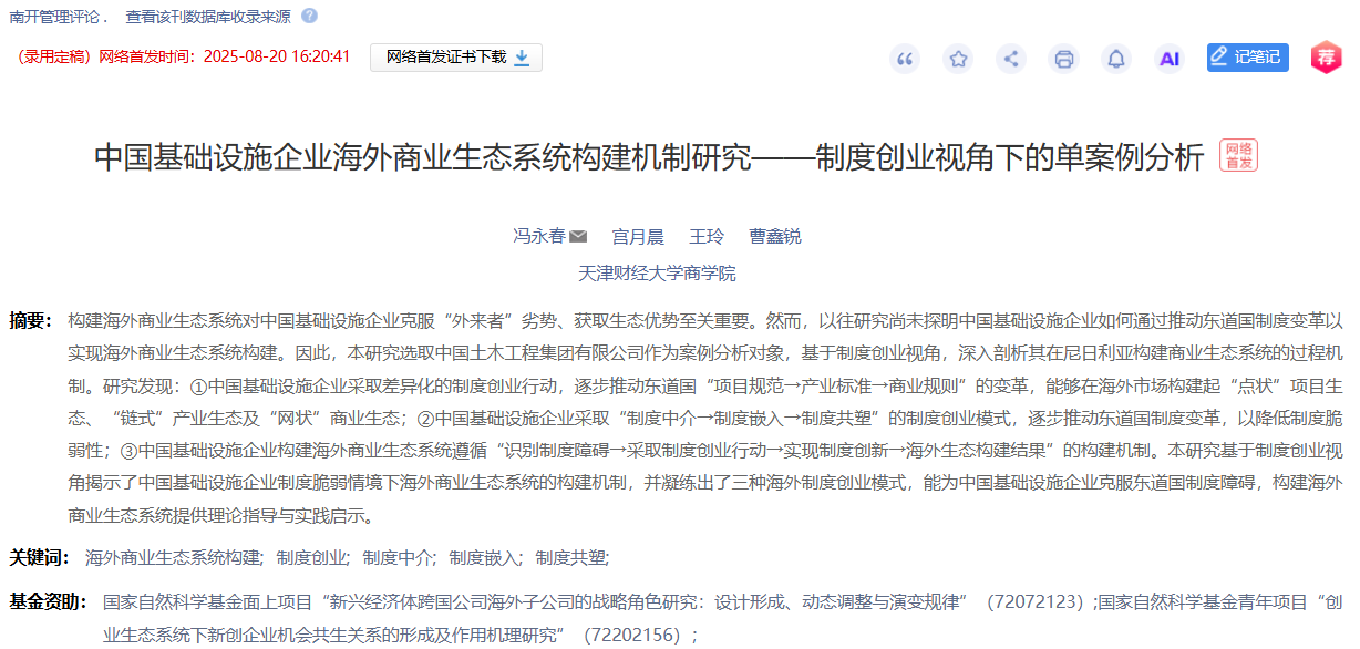 yl6809永利官网企业管理系冯永春副教授团队的论文“中国基础设施企业海外商业生态系统构建机制研究”在中文高质量期刊《南开管理评论》网络首发。